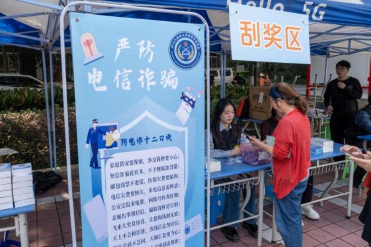 会场外,学校保卫处及国防军事协会在月亮广场搭建了校园反诈宣传点,与沙坪坝区人民法院联动开展反诈专题宣传。通过车载便民法庭大屏幕播放反诈宣传片,开展“校园反诈刮刮乐”,发放反诈宣传图册等寓教于乐的形式,吸引了广大师生、居民前来参与。