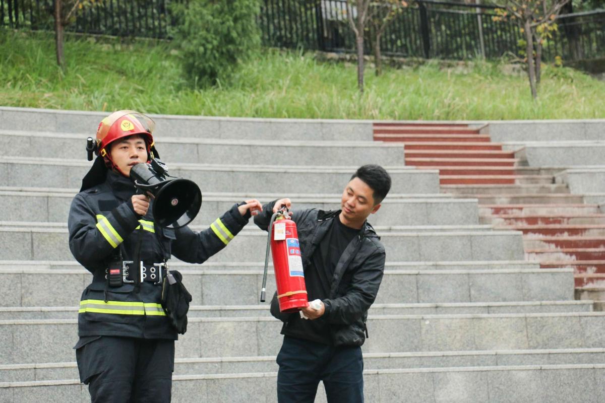 逃生和救援结束后,全体参与演练师生来到学校钟楼广场,磁器口消防救援站专业技术干部余炘林为师生详细讲解了消防器材的正确使用方法,并现场演示了灭火器灭火的操作步骤。师生在工作人员的指导下有序使用灭火器进行灭火。
