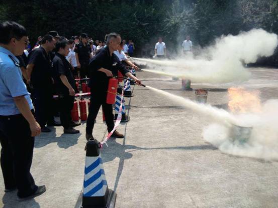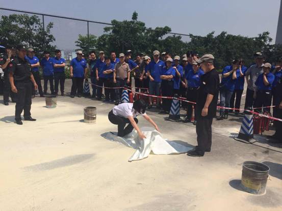 消防实战演练地点设在松苑20舍旁小操场内。李教官采用理论与实践相结合的方法,现场给员工们演示灭火毯的使用方法。然后每位员工按照李教官教授的“一摇、二拔、三喷射”的操作方法,依次使用干粉灭火器,将铁桶内的火成功扑灭。