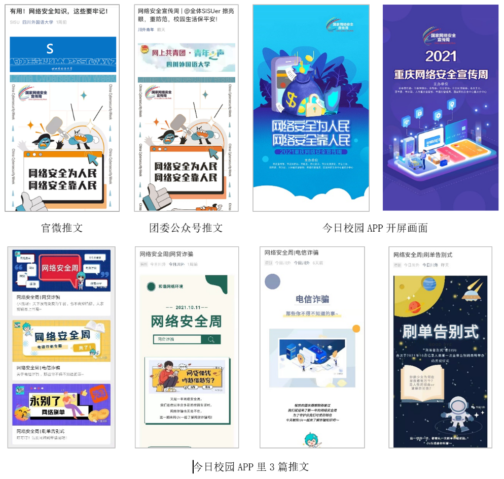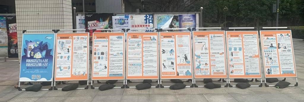 学校分别在山上歌乐广场和山下太阳广场摆放宣传展板,并加以LED电子屏辅助宣传。还通过微信公众号、今日校园APP等媒介,以幽默漫画及真实案例等形式,为师生普及网络安全知识,帮助师生提高个人信息安全风险意识、防范意识及法律意识,学习实用防范措施,吸引了大批师生驻足浏览或点击阅读。