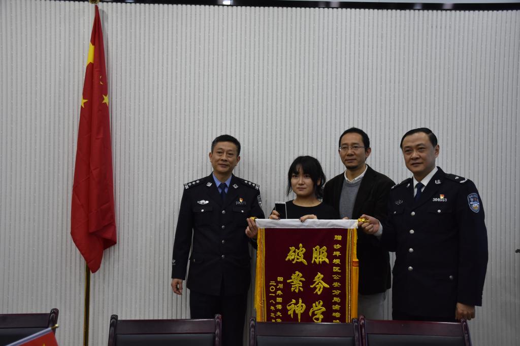 3月12日上午,渝碚路派出所所长李康,教导员何忠,沙分局校保支队支队长罗勇及随行民警主动上门,到学校保卫处将被盗手机退还失主,并接受了我校留学生部赠予的锦旗。李康所长代表警方向大岛千草同学表示:“中国是全世界社会治安最好的国家之一,公安机关高度重视涉校涉生案件,不论案件大不小,一视同仁,一追到底。”大岛千草同学接过失而复得的手机非常感动,频频向民警同志鞠躬致谢。