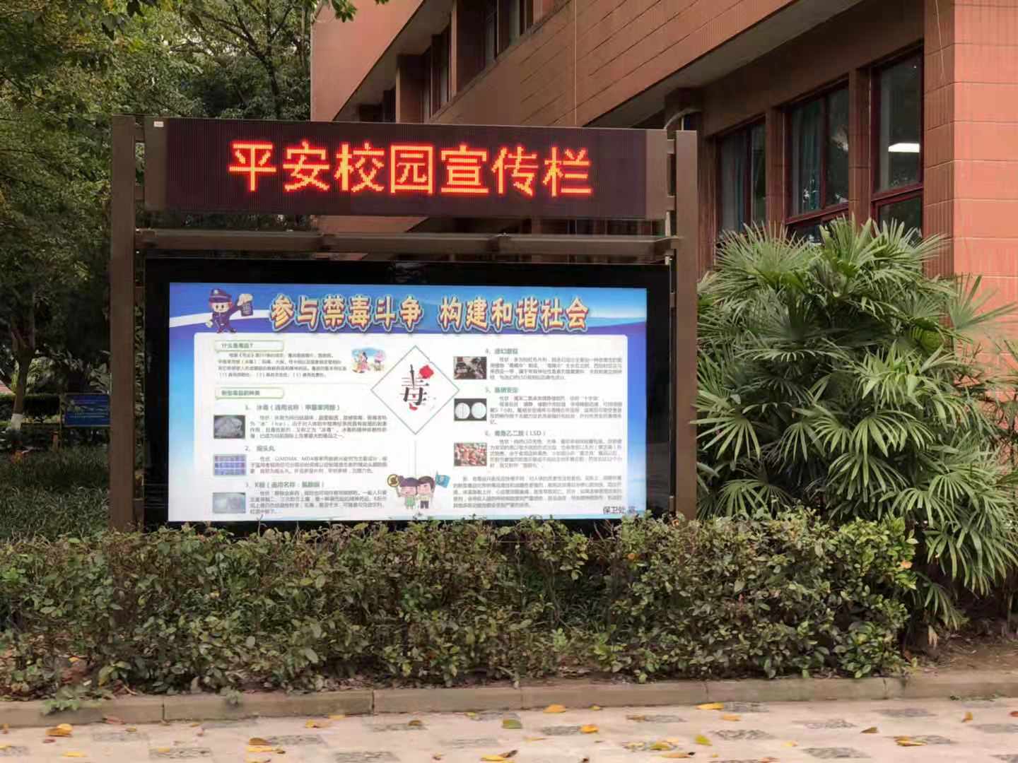 我校高度重视禁毒宣传教育工作。2019年6月26日是国际禁毒日,为进一步加强校园法制和禁毒宣传教育力度,增强师生拒毒防毒的意识,保卫处与南京妙策传媒广告公司合作,利用在学校重点路段设置的4个电子宣传栏进行了为期一周的禁毒电子展板、资料的滚动宣传,吸引了大量师生驻足观看。
