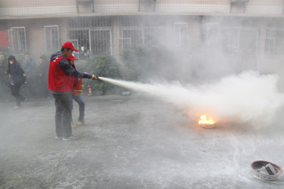 演练开始前,杨果为大家详细讲解了火灾逃生的方法和灭火器材的使用要点。16时30分,消防警报响起,演练正式开始。兰苑1舍留舍同学在消防志愿者引导下迅速、有序、安全地从消防通道疏散。油盆里火焰熊熊,消防志愿者和师生代表接到扑救命令后右手提着灭火器,左手握着喷管对准着火点喷射,果断利落地将油盆内的火苗扑灭。此次演练使广大师生熟练掌握了科学逃生自救的方法,进一步提高了师生消防安全意识,取得了很好的消防技能实践教学效果。