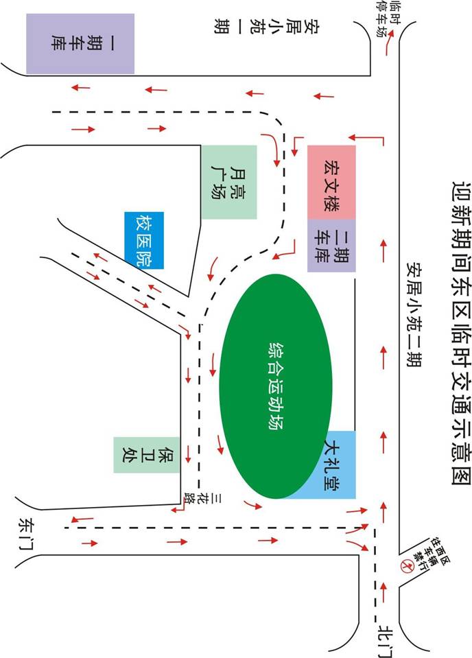 二、整个东区交通为逆时针单向循环:所有车辆自东门或北门入校后,均从大礼堂背面道路进入安居小苑,从宏文楼旁道闸处驶出,经由三花路从东门或北门出校。(东区临时交通示意图附后)