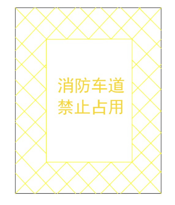在单位或者住宅区的消防车通道出入口路面,按照消防车通道净宽施划禁停标线,标线为黄色网状实线,外边框线宽20厘米,内部网格线宽10厘米,内部网格线与外边框夹角45度,标线中央位置沿行车方向标注内容为“消防车道 禁止占用”的警示字样(示例见图2)。
